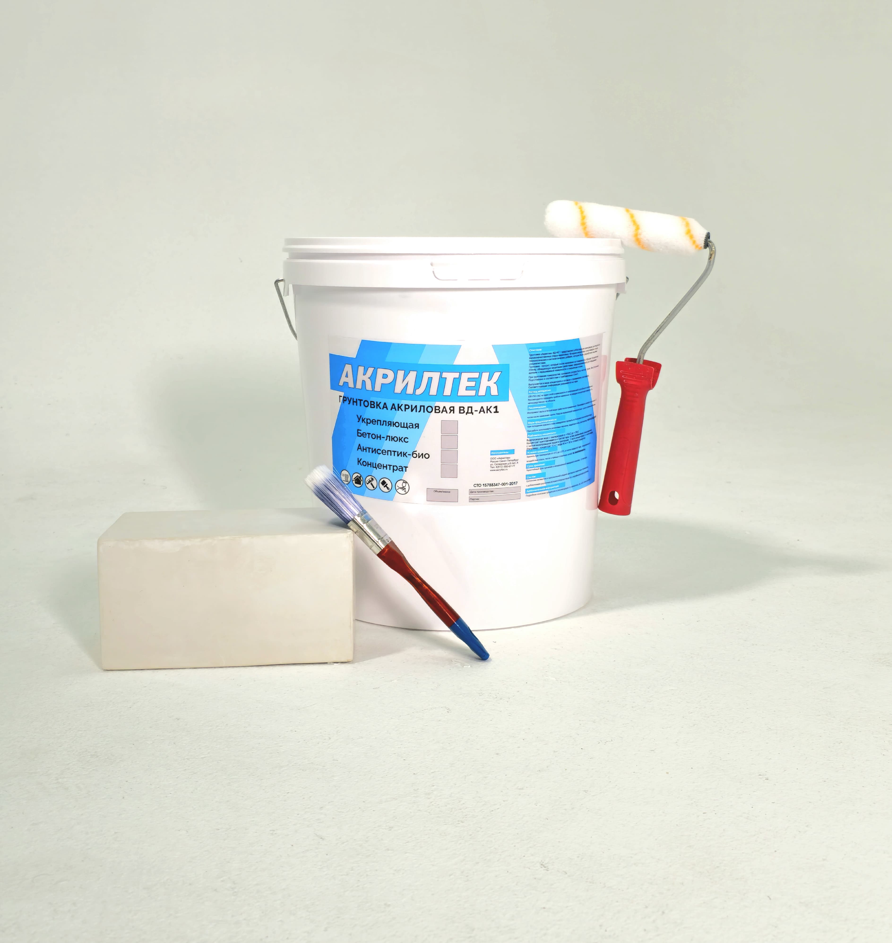 Усилинная пропитка АКРИЛТЕК АК-ВД 1 “Primer” предназначена для финишной пропитки, значительного упрочнения и подготовки полусухой стяжки перед окрашиванием. Защищает бетонные поверхности от шелушения, придает поверхностную прочность основанию иэластичность. Проникает на глубину до 50мм. Имеет рекордный сухой остаток в 30%, что значительно повышает качество конечно покрытия. т.к. именно специальное связующее надежно связывает бетон по всей толщине стяжки